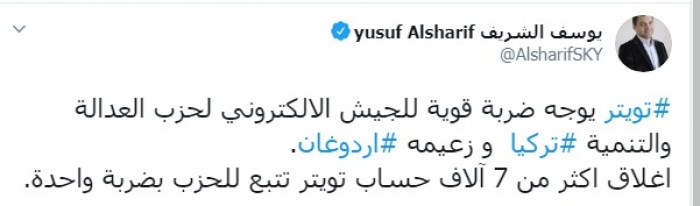 وكتب عبر تغريدة له على "تويتر" رصدها " المشهد العربي":"تويتر يوجه ضربة قوية للجيش الإلكتروني لحزب العدالة والتنمية تركيا و زعيمه أردوغان".