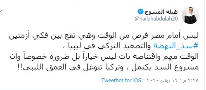 وأضافت: "الوقت مهم واقتناصه بات ليس خياراً بل ضرورة خصوصاً وأن مشروع السد يكتمل ، وتركيا تتوغل في العمق الليبي".