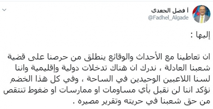 وكتب عبر تغريدة له على " تويتر " رصدها " المشهد العربي": إن تعاطينا مع الأحداث والوقائع ينطلق من حرصنا على قضية شعبنا العادلة ، ندرك أن هناك تدخلات دولية وإقليمية وإننا لسنا اللاعبين الوحيدين في الساحة ، وفي كل هذا الخضم نؤكد أننا لن نقبل بأي مساومات أو ممارسات أو ضغوط تنتقص من حق شعبنا في حريته وتقرير مصيره".