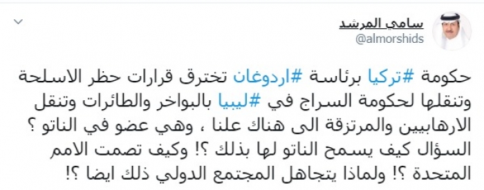 وكتب عبر تغريدة له على "تويتر" رصدها " المشهد العربي":"حكومة تركيا برئاسة أردوغان تخترق قرارات حظر الأسلحة وتنقلها لحكومة السراج في ليبيا بالبواخر والطائرات وتنقل الإرهابيين والمرتزقة إلى هناك علنا ، وهي عضو في الناتو ؟ السؤال كيف يسمح الناتو لها بذلك ؟! وكيف تصمت الأمم المتحدة ؟! ولماذا يتجاهل المجتمع الدولي ذلك ايضا".
