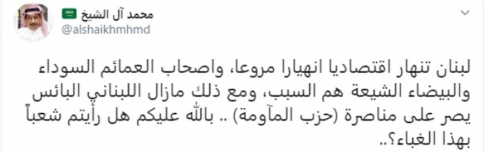 وكتب في تغريدة عبر "تويتر" رصدها "المشهد العربي": "لبنان تنهار اقتصاديًا انهيارا مروعا، وأصحاب العمائم السوداء والبيضاء الشيعة هم السبب، ومع ذلك ما زال اللبناني البائس يصر على مناصرة (حزب المآومة).. بالله عليكم هل رأيتم شعباً بهذا الغباء؟".