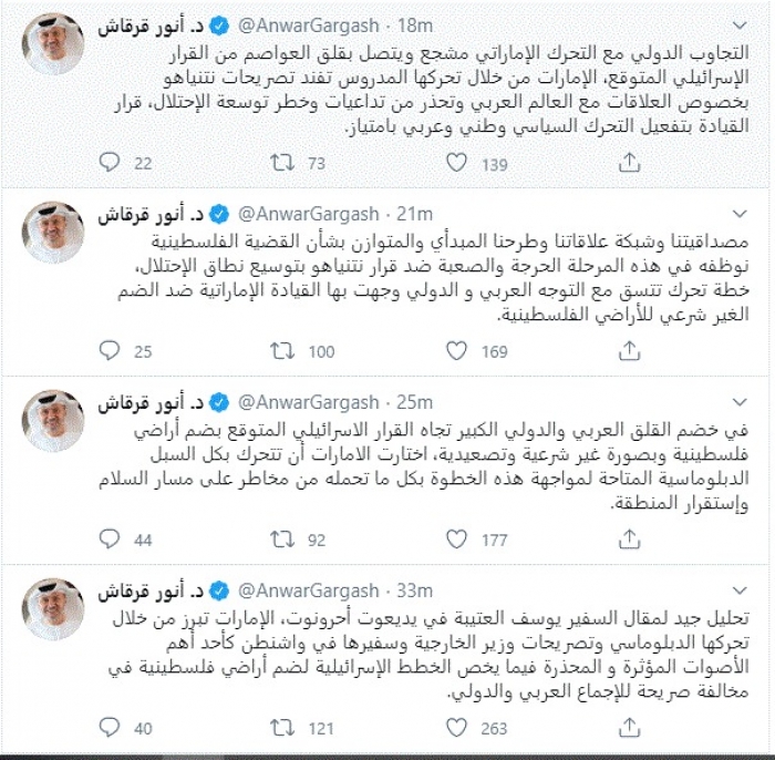 وكتب في سلسلة تغريدات عبر "تويتر" رصدها "المشهد العربي": "تحليل جيد لمقال السفير يوسف العتيبة في يديعوت أحرونوت، الإمارات تبرز من خلال تحركها الدبلوماسي وتصريحات وزير الخارجية وسفيرها في واشنطن كأحد أهم الأصوات المؤثرة و المحذرة فيما يخص الخطط الإسرائيلية لضم أراضي فلسطينية في مخالفة صريحة للإجماع العربي والدولي".