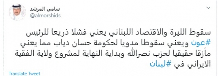 وقال في تغريدة عبر "تويتر" رصدها "المشهد العربي": "سقوط الليرة والاقتصاد اللبناني يعني فشلاً ذريعًا للرئيس عون ويعني سقوطا مدويا لحكومة حسان دياب مما يعني مأزقا حقيقيا لحزب نصرالله وبداية النهاية لمشروع ولاية الفقية الايراني في لبنان".
