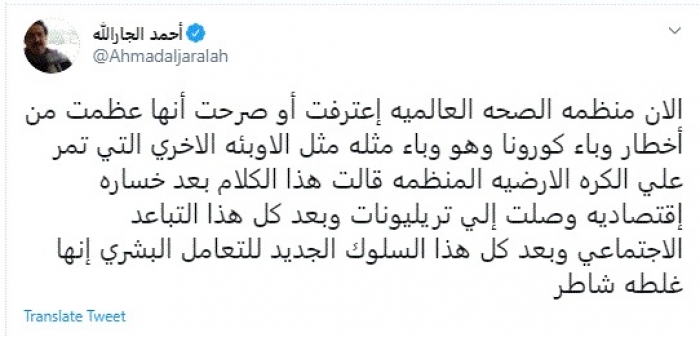 قال عميد الصحافة الكويتية ورئيس تحرير صحيفة السياسة الكويتية أحمد الجارالله، إن منظمت الصحة العالمية اعترفت بأنها بالغت من خطر وباء كورونا.
