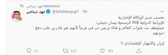 وقال في تغريدة عبر "تويتر" رصدها "المشهد العربي": "بحسب مدير الوكالة الإخبارية الإيرانية الدولية IRIB الرسمية بيمان جبيلي: سيتوقف بث قنوات العالم وقناة بريس تي في قريباً لأنهم غير قادرين على دفع ديونهم إيران والانهيار الاقتصادي".