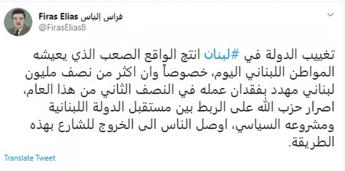 وكتب في تغريدة عبر "تويتر" رصدها "المشهد العربي": "تغييب الدولة في لبنان أنتج الواقع الصعب الذي يعيشه المواطن اللبناني اليوم، خصوصاً وأن اكثر من نصف مليون لبناني مهدد بفقدان عمله في النصف الثاني من هذا العام".
