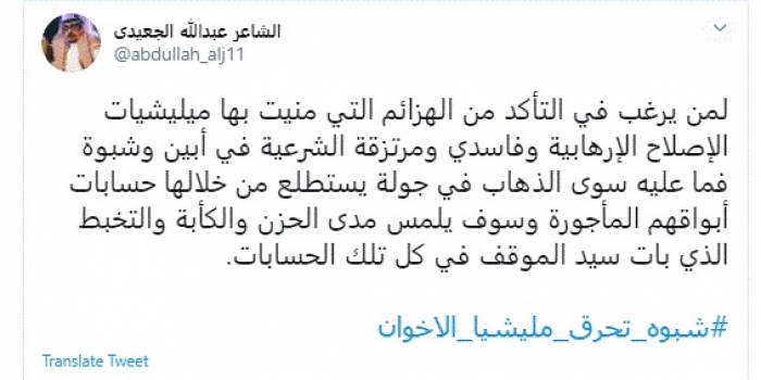 وقال في تغريدة عبر "تويتر" رصدها "المشهد العربي": "لمن يرغب في التأكد من الهزائم التي منيت بها مليشيات الإصلاح الإرهابية وفاسدي ومرتزقة الشرعية في أبين وشبوة ".