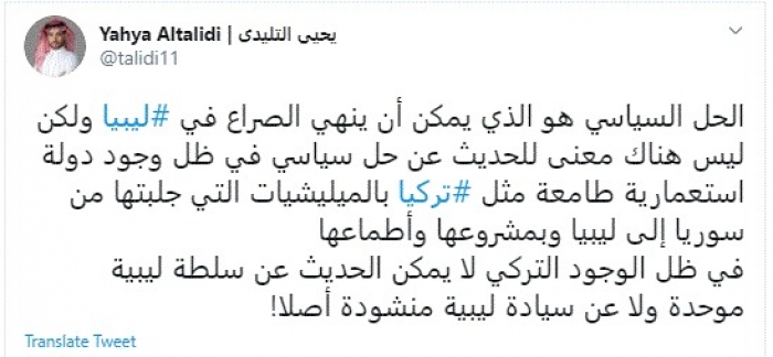 وقال في تغريدة عبر "تويتر" رصدها "المشهد العربي": "الحل السياسي هو الذي يمكن أن ينهي الصراع في ليبيا ولكن ليس هناك معنى للحديث عن حل سياسي في ظل وجود دولة استعمارية طامعة مثل تركيا بالميليشيات التي جلبتها من سوريا إلى ليبيا وبمشروعها وأطماعها".
