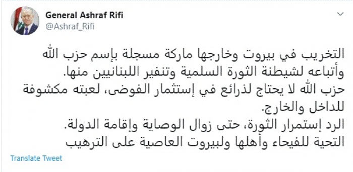 قال الوزير اللبناني السابق اللواء أشرف ريفي، اليوم، إن التخريب في بيروت وخارجها ماركة مسجلة باسم حزب الله وأتباعه لشيطنة الثورة السلمية.