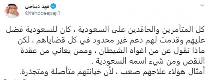 وقال في تغريدة عبر "تويتر" رصدها "المشهد العربي": "كل المتآمرين والحاقدين على السعودية، كان للسعودية فضل عليهم وقدمت لهم دعم غير محدود في كل قضاياهم، لكن ماذا نقول عن من أغواه الشيطان، وممن يعاني من عقدة النقص ومن شيء اسمه السعودية".