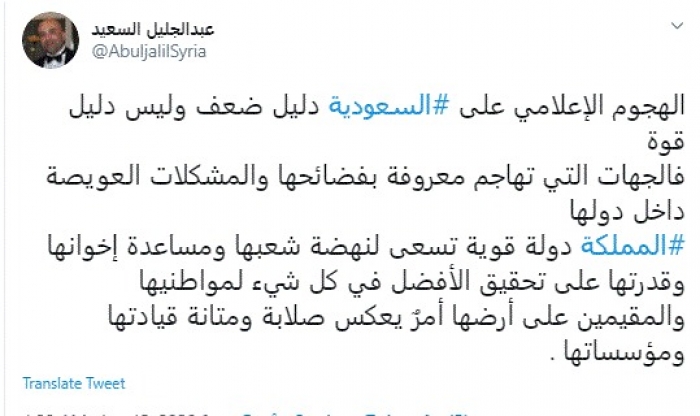 وكتب في تغريدة عبر "تويتر" رصدها "المشهد العربي": "الهجوم الإعلامي على السعودية دليل ضعف وليس دليل قوة فالجهات التي تهاجم معروفة بفضائحها والمشكلات العويصة داخل دولها".