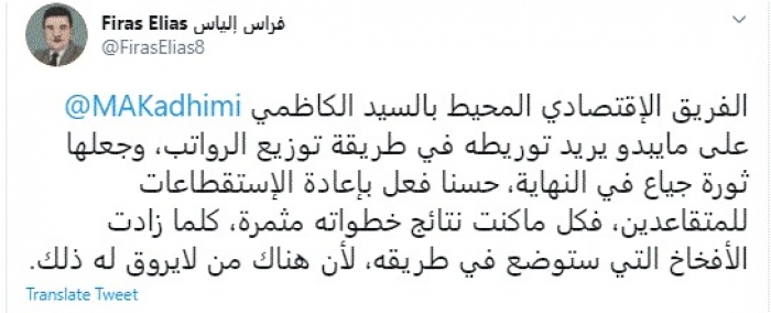 وقال في تغريدة عبر "تويتر" رصدها "المشهد العربي": "الفريق الإقتصادي المحيط بالسيد الكاظمي على ما يبدو يريد توريطه في طريقة توزيع الرواتب، وجعلها ثورة جياع في النهاية".