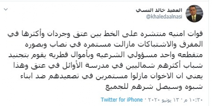 حذر الكاتب والمحلل العسكري العميد خالد النسي، من مؤامرة تخطط لها أذناب دويلة قطر ضد أبناء شبوة، بعد تمويل المليشيات الإخوانية بأموال قطرية من قبل المدعو "الجبواني" المسؤول في ما تسمى بحكومة الشرعية، والذي يقوم بتجنيد بعض الشباب من الشمال في عتق لتفجير الأوضاع بشبوة.