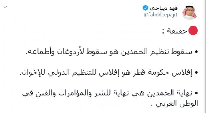 وكتب عبر تغريدة له على "تويتر" رصدها " المشهد العربي": "حقيقة، سقوط تنظيم الحمدين هو سقوط لأردوغان وأطماعه، إفلاس حكومة قطر هو إفلاس للتنظيم الدولي للإخوان".