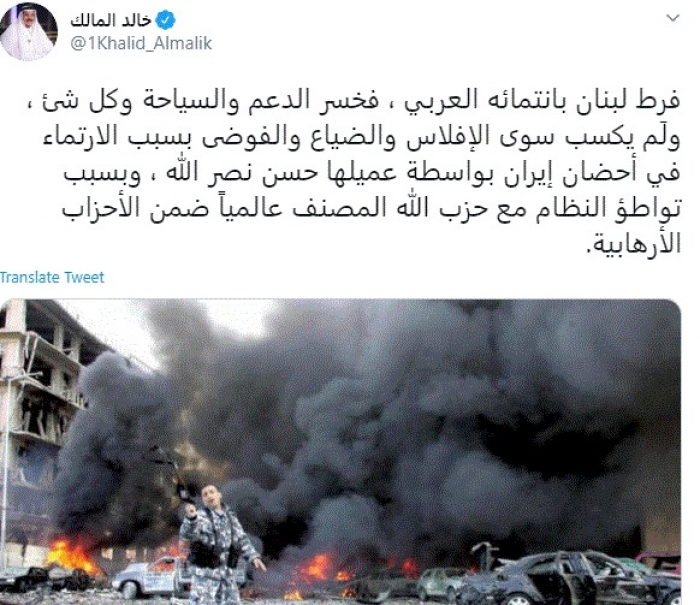 وكتب في تغريدة عبر "تويتر" رصدها "المشهد العربي": "فرط لبنان بانتمائه العربي، فخسر الدعم والسياحة وكل شئ، ولَم يكسب سوى الإفلاس والضياع والفوضى بسبب الارتماء في أحضان إيران بواسطة عميلها حسن نصر الله، وبسبب تواطؤ النظام مع حزب الله المصنف عالمياً ضمن الأحزاب الأرهابية".