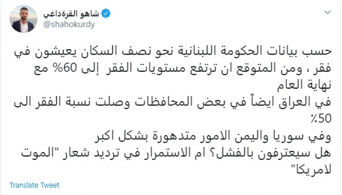 وقال في تغريدة عبر "تويتر" رصدها "المشهد العربي": "حسب بيانات الحكومة اللبنانية نحو نصف السكان يعيشون في فقر، ومن المتوقع أن ترتفع مستويات الفقر إلى 60% مع نهاية العام".