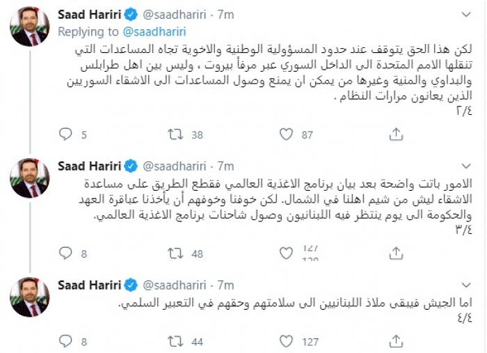 علق رئيس الوزراء اللبناني السابق سعد الحريري، اليوم، على حرق شاحنات تابعة للأمم المتحدة متوجهة إلى سوريا.