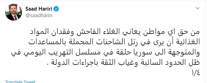 الحريري يُعلق على حرق الشاحنات المتوجهة إلى سوريا