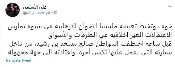 وأضاف: "قبل ساعة اختطفت المواطن صالح مسعد بن رشيد، من داخل سيارته التي يعمل عليها تاكسي أجرة، واقتادته إلى جهة مجهولة".
