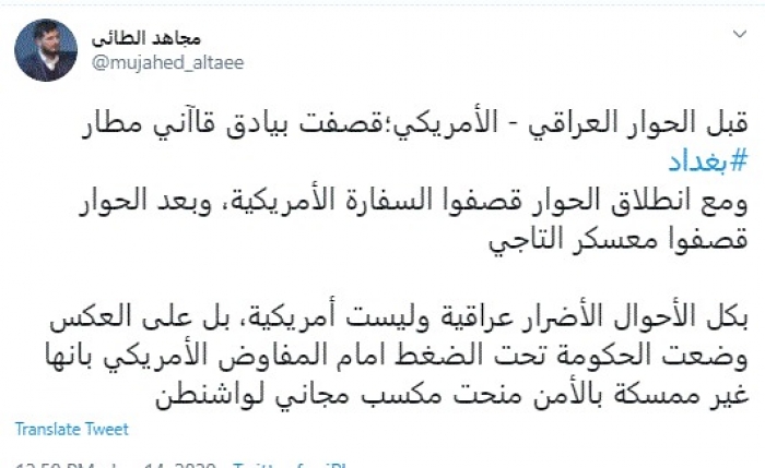 وقال في تغريدة عبر "تويتر" رصدها "المشهد العربي": "قبل الحوار العراقي- الأمريكي؛ قصفت بيادق قاآني مطار بغداد ومع انطلاق الحوار قصفوا السفارة الأمريكية، وبعد الحوار قصفوا معسكر التاجي".