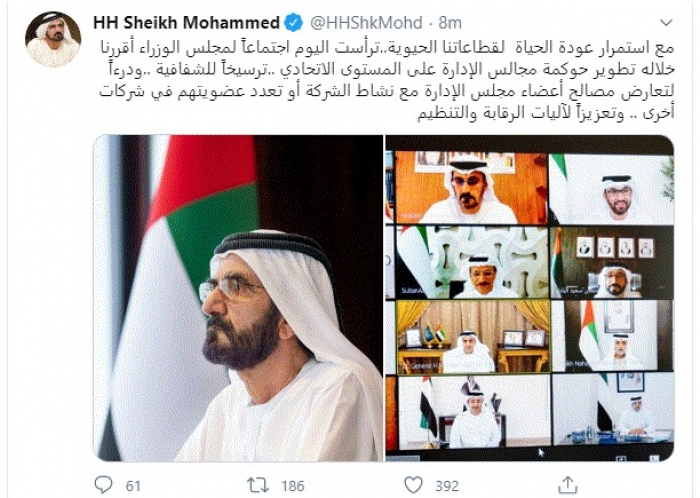 وقال في تغريدات عبر "تويتر" رصدها "المشهد العربي": "مع استمرار عودة الحياة لقطاعاتنا الحيوية.. ترأست اليوم اجتماعاً لمجلس الوزراء أقررنا خلاله تطوير حوكمة مجالس الإدارة على المستوى الاتحادي..ترسيخاً للشفافية ..ودرءاً لتعارض مصالح أعضاء مجلس الإدارة مع نشاط الشركة أو تعدد عضويتهم في شركات أخرى .. وتعزيزاً لآليات الرقابة والتنظيم".