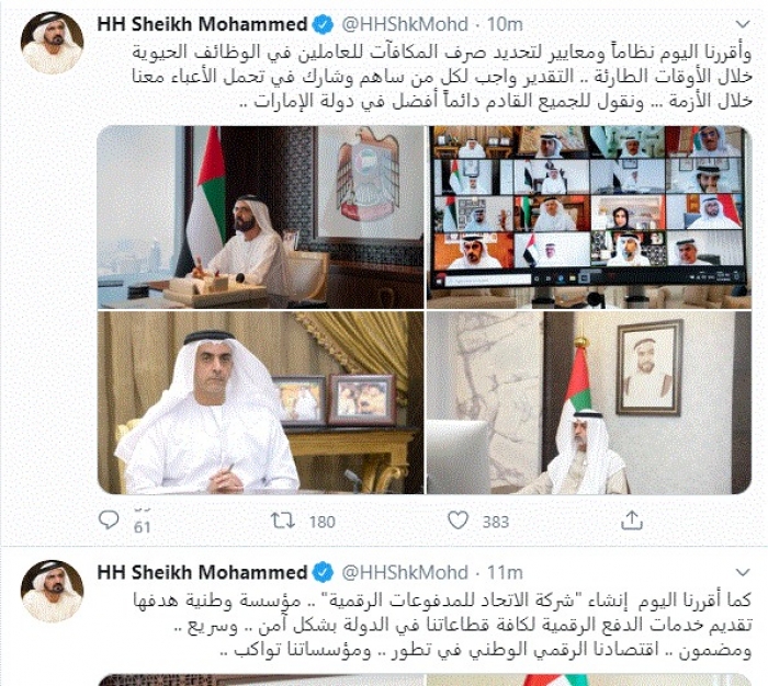 وأوضح: "وأقررنا اليوم نظاماً ومعايير لتحديد صرف المكافآت للعاملين في الوظائف الحيوية خلال الأوقات الطارئة .. التقدير واجب لكل من ساهم وشارك في تحمل الأعباء معنا خلال الأزمة ... ونقول للجميع القادم دائماً أفضل في دولة الإمارات".