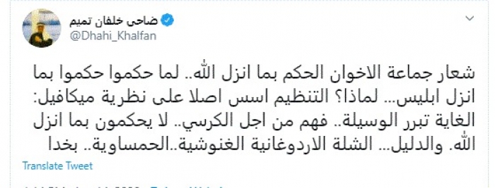 وقال في تغريدة عبر "تويتر" رصدها "المشهد العربي": "شعار جماعة الإخوان الحكم بما أنزل الله.. لما حكموا حكموا بما أنزل إبليس... لماذا؟".