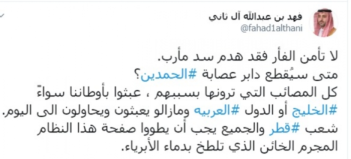 وكتب عبر تغريدة له على "تويتر" رصدها " المشهد العربي": "لا تأمن الفأر فقد هدم سد مأرب، متى سيُقطع دابر عصابة الحمدين؟".