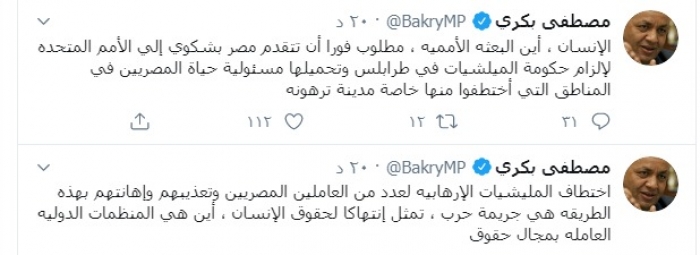 وتساءل بكري، أين هي المنظمات الدولية العاملة بمجال حقوق الإنسان ، أين البعثة الأممية، مطلوب فورا أن تتقدم مصر بشكوي إلى الأمم المتحدة لإلزام حكومة الميلشيات في طرابلس وتحميلها مسئولية حياة المصريين في المناطق التي اختطفوا منها خاصة مدينة ترهونة".
