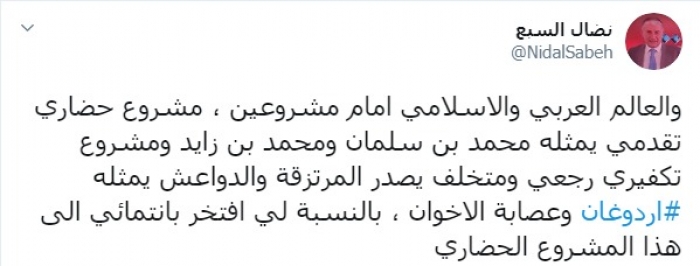 وكتب عبر تغريدة له على "تويتر" رصدها " المشهد العربي": والعالم العربي والإسلامي أمام مشروعين، مشروع حضاري تقدمي يمثله محمد بن سلمان ومحمد بن زايد، ومشروع تكفيري رجعي ومتخلف يصدر المرتزقة والدواعش يمثله أردوغان وعصابة الإخوان، بالنسبة لي افتخر بانتمائي إلى هذا المشروع الحضاري".