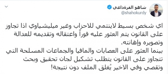 كشف الكاتب الصحفي العراقي شاهو القرة داغي، اليوم الأحد، عن اعتداء الجماعات المسلحة والمافيا والعصابات على القانون بالعراق.