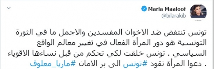 أشادت الإعلامية اللبنانية ماريا معلوف، اليوم الإثنين، بمواقف المرأة التونسية القوية ضد الإخوان.