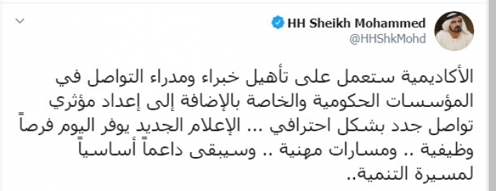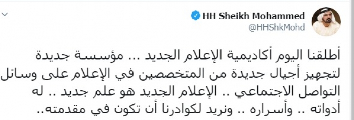وكتب عبر تغريدة له على "تويتر" رصدها " المشهد العربي": "أطلقنا اليوم أكاديمية الإعلام الجديد، مؤسسة جديدة لتجهيز أجيال جديدة من المتخصصين في الإعلام على وسائل التواصل الاجتماعي، الإعلام الجديد هو علم جديد له أدواته وأسراره ونريد لكوادرنا أن تكون في مقدمته".