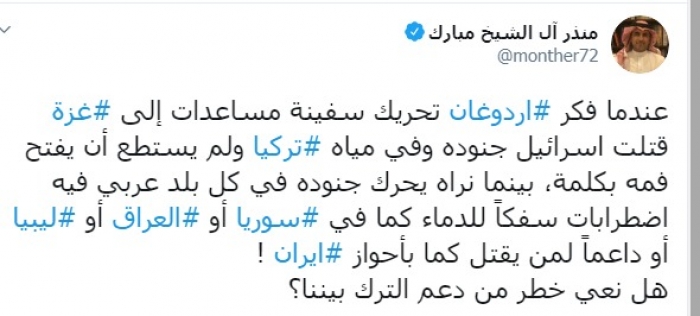 وكتب عبر تغريدة له على "تويتر" رصدها " المشهد العربي": "عندما فكر أردوغان تحريك سفينة مساعدات إلى غزة قتلت إسرائيل جنوده وفي مياه تركيا ولم يستطع أن يفتح فمه بكلمة، بينما نراه يحرك جنوده في كل بلد عربي فيه اضطرابات سفكاً للدماء كما في سوريا أو العراق أوليبيا أو داعماً لمن يقتل كما بأحواز إيران".