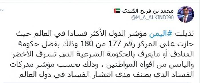 وكتب عبر تغريدة له على "تويتر" رصدها " المشهد العربي": "تذيلت اليمن مؤشر الدول الأكثر فسادًا في العالم حيث حازت على المركز رقم 177 من 180 وذلك بفضل حكومة الفنادق أو ما يعرف بالحكومة الشرعية التي تسرق الأخضر واليابس من أفواه المواطنين، وذلك بحسب مؤشر مدركات الفساد الذي يصنف مدى انتشار الفساد في دول العالم".