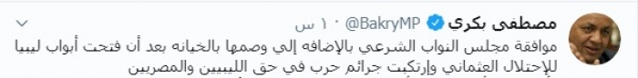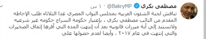 وكتب عبر تغريدة له على "تويتر" رصدها " المشهد العربي":"تناقش لجنة الشئون العربية بمجلس النواب المصري غدا الثلاثاء طلب الإحاطة المقدم من النائب مصطفي بكري، باعتبار حكومة السراج حكومة غير شرعية و لا تستند إلى أية مبررات قانونية بعد أن انتهت المدة التي أقرها اتفاق الصخيرات والتي انتهت في عام ٢٠١٧ ، وأيضا لعدم حصولها على موافقة مجلس النواب الشرعي بالإضافة إلى وصمها بالخيانة بعد أن فتحت أبواب ليبيا للاحتلال العثماني وارتكبت جرائم حرب في حق الليبيين والمصريين ".