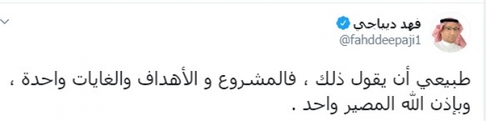 وكتب عبر تغريدة له على "تويتر" رصدها " المشهد العربي":"طبيعي أن يقول ذلك ، فالمشروع و الأهداف والغايات واحدة ، وبإذن الله المصير واحد".