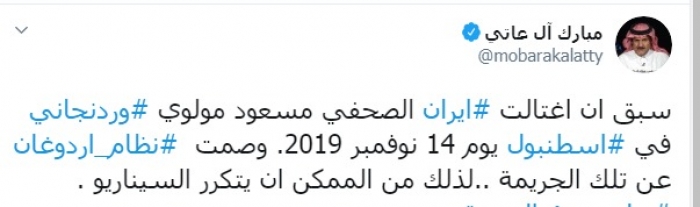 وكتب عبر تغريدة له على "تويتر" رصدها " المشهد العربي":" سبق أن اغتالت إيران الصحفي مسعود مولوي وردنجاني في إسطنبول يوم 14 نوفمبر 2019، وصمت نظام إردوغان عن تلك الجريمة، لذلك من الممكن أن يتكرر السيناريو".