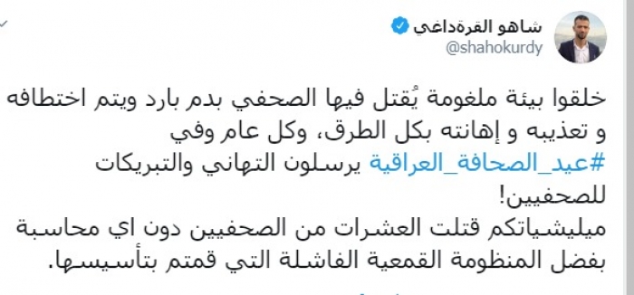 وكتب عبر تغريدة له على "تويتر" رصدها " المشهد العربي":" خلقوا بيئة ملغومة يُقتل فيها الصحفي بدم بارد ويتم اختطافه و تعذيبه و إهانته بكل الطرق، وكل عام وفي عيد الصحافة العراقية يرسلون التهاني والتبريكات للصحفيين".