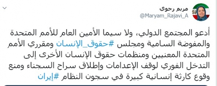 وكتبت عبر تغريدة لها على "تويتر" رصدها " المشهد العربي": "أدعو المجتمع الدولي، ولا سيما الأمين العام للأمم المتحدة والمفوضة السامية ومجلس حقوق الإنسان ومقرري الأمم المتحدة المعنيين ومنظمات حقوق الإنسان الأخرى إلى التدخل الفوري لوقف الإعدامات وإطلاق سراح السجناء ومنع وقوع كارثة إنسانية كبيرة في سجون النظام إيران".