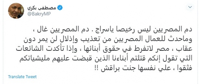 وقال في تغريدة عبر "تويتر" رصدها "المشهد العربي": "دم المصريين ليس رخيصا ياسراج. دم المصريين غال، وما حدث للعمال المصريين من تعذيب وإذلال لن يمر دون عقاب، مصر لا تفرط في حقوق أبنائها".