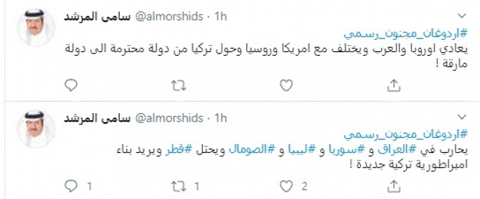 وكتب في تغريدات عبر "تويتر" رصدها "المشهد العربي": "أردوغان مجنون رسمي يحارب في العراق وسوريا وليبيا والصومال ويحتل قطر ويريد بناء إمبراطورية تركية جديدة".