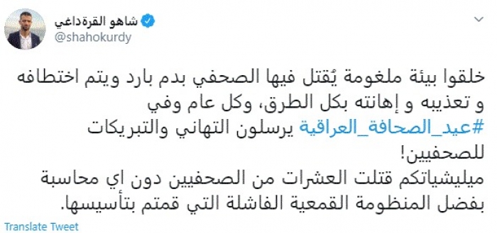 وكتب في تغريدة عبر "تويتر" رصدها "المشهد العربي": "خلقوا بيئة ملغومة يُقتل فيها الصحفي بدم بارد ويتم اختطافه و تعذيبه وإهانته بكل الطرق، وكل عام وفي عيد الصحافة العراقية يرسلون التهاني والتبريكات للصحفيين".