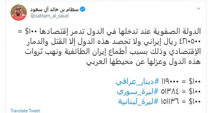 وكتب في تغريدة عبر "تويتر" رصدها "المشهد العربي": "الدولة الصفوية عند تدخلها في الدول تدمر إقتصادها ١٠٠$ = ٤٢١٠٥٠٠ ريال إيراني ولا تحصد هذه الدول إلا القتل والدمار الإقتصادي وذلك بسبب أطماع إيران الطائفية ونهب ثروات هذه الدول وعزلها عن محيطها العربي".
