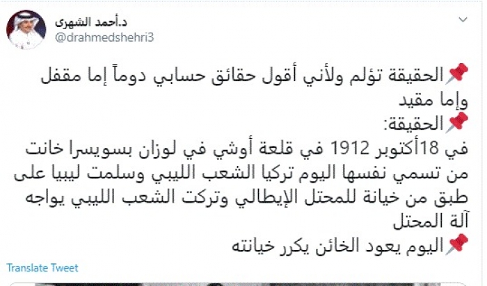 وقال في تغريدة عبر "تويتر" رصدها "المشهد العربي": "الحقيقة: في 18 أكتوبر 1912 في قلعة أوشي في لوزان بسويسرا خانت من تسمي نفسها اليوم تركيا الشعب الليبي وسلمت ليبيا على طبق من خيانة للمحتل الإيطالي وتركت الشعب الليبي يواجه آلة المحتل".