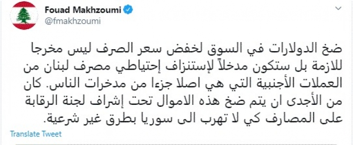 وقال في تغريدة عبر "تويتر" رصدها "المشهد العربي": "ضخ الدولارات في السوق لخفض سعر الصرف ليس مخرجا للازمة بل ستكون مدخلاً لاستنزاف احتياطي مصرف لبنان من العملات الأجنبية التي هي أصلا جزءًا من مدخرات الناس".