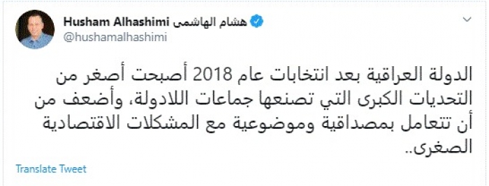 وقال في تغريدة عبر "تويتر" رصدها "المشهد العربي": "الدولة العراقية بعد انتخابات عام 2018 أصبحت أصغر من التحديات الكبرى التي تصنعها جماعات اللادولة، وأضعف من أن تتعامل بمصداقية وموضوعية مع المشكلات الاقتصادية الصغرى".