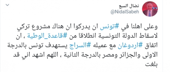 وكتب عبر تغريدة له على "تويتر" رصدها " المشهد العربي": "وعلى أهلنا في تونس أن يدركوا أن هناك مشروع تركي لإسقاط الدولة التونسية انطلاقا من قاعدة الوطية".