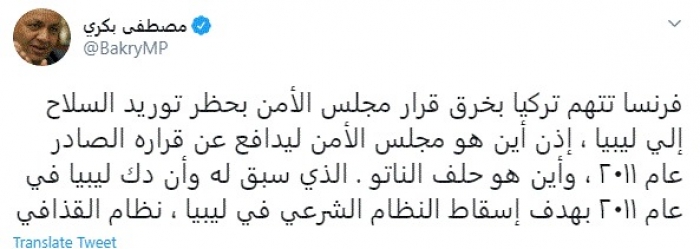 بكري يُعلق على اتهامات فرنسا لتركيا بحظر توريد السلاح لليبيا (تفاصيل)