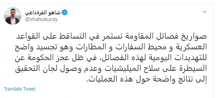 وكتب في تغريدة عبر "تويتر" رصدها "المشهد العربي": "صواريخ فصائل المقاومة تستمر في التساقط على القواعد العسكرية ومحيط السفارات والمطارات وهو تجسيد واضح للتهديدات اليومية لهذه الفصائل".